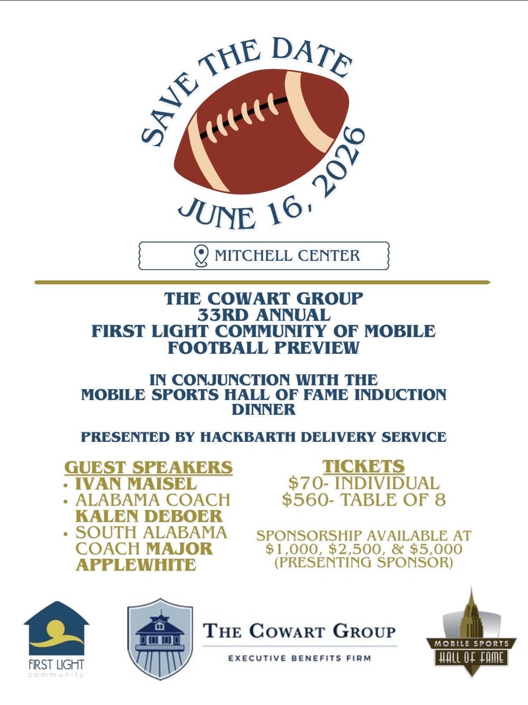 We are happy announce the partnership of FLC Annual Football Preview with the Mobile Sports Hall of Fame induction dinner for their class of 2026.